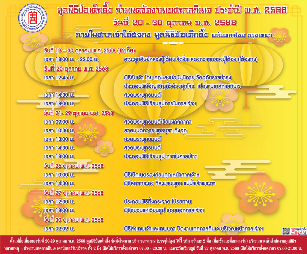 วันจันทร์ที่ 20 ตุลาคม พ.ศ. 2568 เวลา 12.45 น. มูลนิธิป่อเต็กตึ๊ง นำโดย ดร.สุทัศน์ เตชะวิบูลย์ รองประธานกรรมการ เป็นประธานในพิธี พร้อมด้วย นายวิชิต ชินวงศ์วรกุล รองประธานกรรมการ นางศิริกุล โอภาสวงศ์ กรรมการและเลขาธิการ นายจารุรัตน์ คุณัตถานนท์ กรรมการและเหรัญญิก นายสุรพงษ์ เตชะหรูวิจิตร กรรมการและรองเลขาธิการ คณะกรรมการ ผู้ช่วยกรรมการ ร่วมในพิธีอัญเชิญกิ้วอ๊วงฮุกโจว (เทพเจ้า 9 องค์ หรือนัยหนึ่ง คือ ดาวพระเคราะห์ทั้ง 9 ดวง) เปิดมณฑลพิธีงานเทศกาลกินเจ ประจำปี 2568 โดยคณะสงฆ์อนัมนิกาย วัดอุภัยราชบำรุง (วัดญวนตลาดน้อย) โดยมี ดร.เสาวนีย์ เตชะไพบูลย์ ภริยาประธานกรรมการ ผู้บริหาร ศิษยานุศิษย์ สาธุชน เจ้าหน้าที่ และอาสาสมัครมูลนิธิฯ ร่วมในพิธี ณ ภายในศาลเจ้าไต้ฮงกง มูลนิธิป่อเต็กตึ๊ง พลับพลาไชย กรุงเทพฯ.เนื่องในเทศกาลกินเจ ประจำปี 2568 มูลนิธิป่อเต็กตึ๊ง ขอเชิญชวนศิษยานุศิษย์และสาธุชนทุกท่าน ร่วมถือศีล อิ่มบุญ อิ่มใจ ศีลกินผัก ละเว้นเนื้อสัตว์ โดยตลอดเทศกาลกินเจ มูลนิธิฯ จัดให้มีบริการอาหารเจ [บรรจุใส่ถุง] แก่ประชาชนฟรี วันละ 2 มื้อ (เช้า และ กลางวัน) เริ่มมื้อเที่ยงของวันที่ 20 ตุลาคม – 29 ตุลาคม 2568 ณ บริเวณทางเข้าสำนักงานมูลนิธิฯ ทั้งนี้ มูลนิธิฯ ขอความกรุณาประชาชนผู้เข้ารับบริการอาหารเจ นำถุงหิ้ว/ถุงผ้า มาบรรจุอาหารด้วยทุกครั้ง.นอกจากนี้ ขอเชิญทุกท่านสักการะหลวงปู่ไต้ฮง เพื่อความเป็นสิริมงคล โดยระหว่าง 21-29 ตุลาคม 2568 จะมีพิธีสวดชัยมงคลคาถา ภายในศาลเจ้าไต้ฮงกง โดย คณะสงฆ์อนัมนิกาย วัดอุภัยราชบำรุง (วัดญวนตลาดน้อย) รวมทั้งขอเชิญทำบุญประทีปโคมไฟ (เต็งลั้ง) ถวายหลวงปู่ไต้ฮงเพื่อความเจริญรุ่งเรือง.และในวันจันทร์ที่ 27 ตุลาคม 2568 เวลา 18.00 น. มูลนิธิป่อเต็กตึ๊ง กำหนดจัดพิธีเวียนธูปศักดิ์สิทธิ์รอบนอกศาลเจ้าไต้ฮงกง ตั้งจิตอธิษฐานขอพรจากเทพเจ้าเพื่อเป็นสิริมงคล โดยเชื่อว่าเมื่อรับพรจากเทพเจ้าแล้ว จะทำให้จิตใจเบิกบาน ผ่องแผ้ว มีแต่ความสุขความเจริญรุ่งเรือง จึงขอเชิญชวนสาธุชน ร่วมพิธีในวันและเวลาดังกล่าว [ทั้งนี้ เนื่องจากขณะนี้อยู่ในช่วงฤดูฝน ผู้มีจิตศรัทธาที่ประสงค์เข้าร่วมพิธี โปรดตรวจสอบสภาพอากาศก่อนการเดินทาง พร้อมจัดเตรียมอุปกรณ์ เตรียมพร้อมสำหรับการเข้าร่วมพิธี] .ติดต่อสอบถาม ติดตามข่าวสาร และกิจกรรมของมูลนิธิป่อเต็กตึ๊ง ได้ที่ เฟซบุ๊ก แฟนเพจ www.facebook.com/atpohtecktung และช่องทางอื่นๆ ที่สะดวกได้ที่ https://linktr.ee/pohtecktung หรือที่สายด่วนป่อเต็กตึ๊ง 1418## มูลนิธิป่อเต็กตึ๊ง ช่วยชีวิต รักษาชีวิต สร้างชีวิต ##