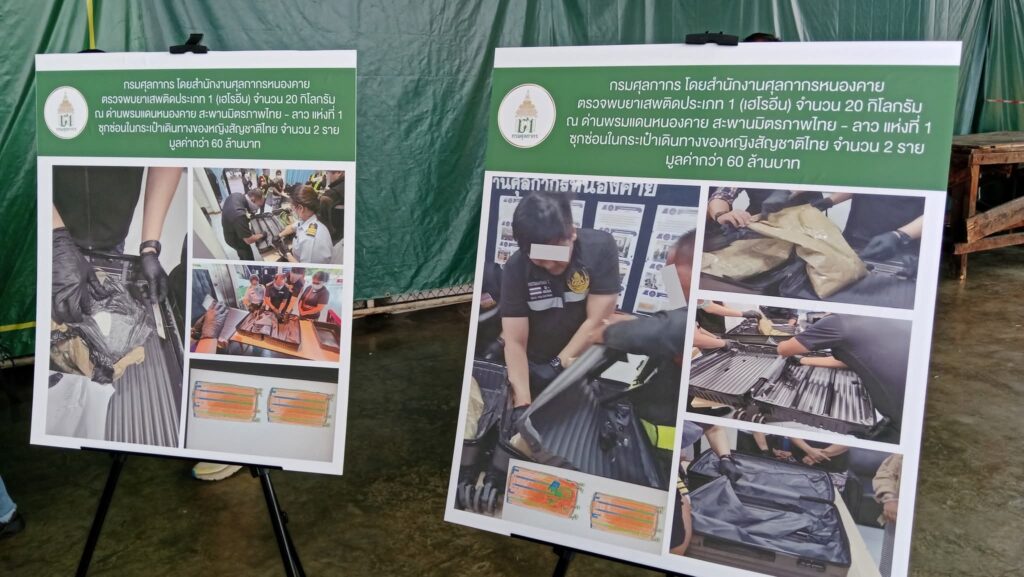 เมื่อวานนี้ (2 พฤศจิกายน 2568) กรมศุลกากร โดยสำนักงานศุลกากรหนองคาย ตรวจพบยาเสพติดให้โทษประเภท 1 (เฮโรอีน) จำนวน 20 กิโลกรัม ณ ด่านพรมแดนหนองคาย สะพานมิตรภาพไทย – ลาว แห่งที่ 1 ซุกซ่อนในกระเป๋าเดินทางของหญิงสัญชาติไทย จำนวน 2 ราย มูลค่ากว่า 60 ล้านบาท เป็นความผิดฐานนำเข้าและมีไว้ในครอบครองซึ่งยาเสพติดให้โทษประเภท 1 อันเป็นความผิดตาม มาตรา 242 และมาตรา 252 แห่ง พ.ร.บ. ศุลกากร พ.ศ. 2560 ประกอบประมวลกฎหมายยาเสพติดอธิบดีกรมศุลกากร กล่าวเพิ่มเติมว่า สำหรับสถิติการจับกุมสินค้าผิดกฎหมายของกรมศุลกากร ในปีงบประมาณ 2568 (ตั้งแต่วันที่ 1 ตุลาคม 2567 – 30 กันยายน 2568) จับกุมทั้งหมด 48,711 ราย มูลค่ากว่า 3,000 ล้านบาท และตั้งแต่วันที่ 1 – 31 ตุลาคม 2568 จับกุมสินค้าผิดกฎหมายอื่นๆ 3,388 ราย มูลค่ากว่า 170 ล้านบาท โดยจับกุมสินค้านำเข้า เช่น เมทแอมเฟตามีน มูลค่า 21 ล้านบาท บุหรี่ มูลค่า 20 ล้านบาท โคคาอีน มูลค่า 16 ล้านบาท สินค้าที่ไม่ได้มาตรฐานผลิตภัณฑ์อุตสาหกรรม มูลค่า 12 ล้านบาท น้ำยาบุหรี่ไฟฟ้า มูลค่า 6 ล้านบาท และจับกุมสินค้าส่งออก เช่น กัญชา มูลค่า 21 ล้านบาท เฮโรอีน มูลค่า 4 ล้านบาท ทองคำ มูลค่า 2 ล้านบาท เมทแอมเฟตามีน มูลค่า 1 ล้านบาท และแอมเฟตามีน มูลค่า 150,000 บาท เป็นต้น ทั้งนี้กรมศุลกากรจะเพิ่มมาตรการในการป้องกันและปราบปรามการลักลอบนำเข้า – ส่งออก สินค้าผิดกฎหมายให้มีประสิทธิภาพมากขึ้น เพื่อปกป้องสังคมให้ปลอดภัย