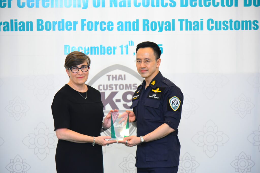 และเจ้าหน้าที่จาก ABF เข้าร่วมพิธี ซึ่งการมอบสุนัขตรวจค้นในครั้งนี้ เป็นความร่วมมือระหว่างกรมศุลกากร