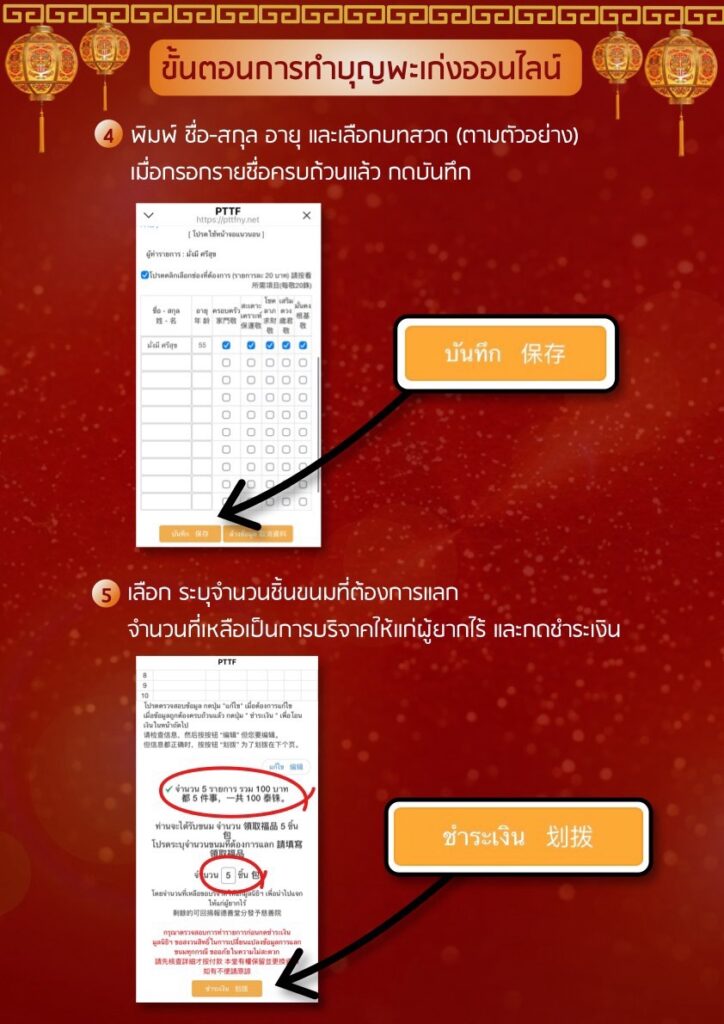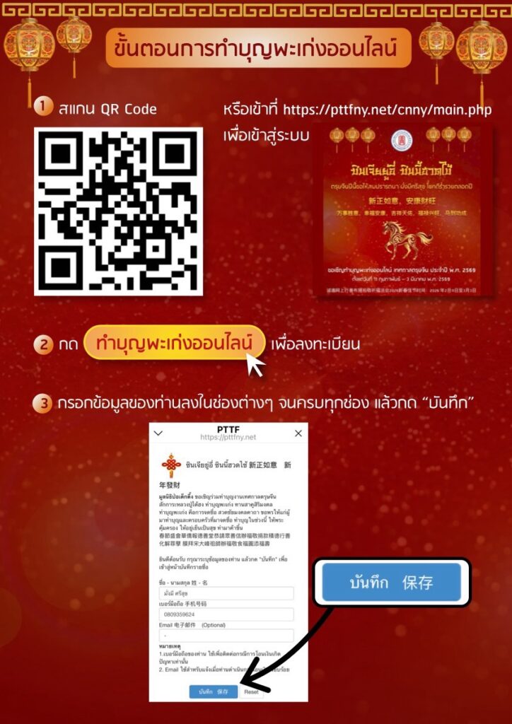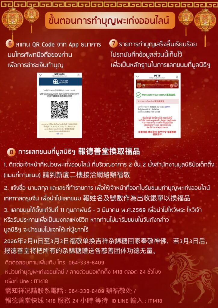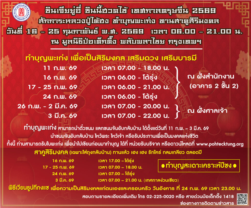ระหว่างวันที่ 16 – 25 กุมภาพันธ์ พ.ศ. 2569 มูลนิธิป่อเต็กตึ๊ง โดย นายวิเชียร เตชะไพบูลย์ ประธานกรรมการ ขอเชิญศิษยานุศิษย์ และสาธุชนทุกท่าน ร่วม “สักการะหลวงปู่ไต้ฮง” ขอพรเนื่องในเทศกาลตรุษจีน ลงชื่อ สวดชัยมงคลคาถา หรือ “พะเก่ง” เพื่อความเป็นสิริมงคลตลอดปี เป็นพิธีมหามงคลใหญ่ 1 ปีมีเพียงครั้งเดียว ที่เปิดให้ทุกท่านได้เลือกทำบุญพะเก่งๆ ละ 20 บาทตามแต่ประสงค์ ประกอบด้วย ขอให้ครอบครัวมีสุข (แกหมึ่งเก่ง) , สะเดาะเคราะห์ (ปออุ่งเก่ง) , เสริมโชคลาภ (คิ่วไฉ่เก่ง) , เสริมดวงชะตา (ส่วยกุงเก่ง) , เสริมความมั่นคงสถาพร (กึงกีเก่ง) รวมถึงทำบุญสะเดาะเคราะห์และเสริมความเป็นสิริมงคลกับรูปปั้นนักษัตรปีมะเมีย รับประทาน “สาคูสิริมงคล” เพื่อความกลมเกลียวและอยู่เย็นเป็นสุข อัญเชิญ “ฮู้แดง” (ยันต์) ของหลวงปู่ไต้ฮง เพื่อนำไปประทับหน้าบ้าน เคหะสถาน หรือพกติดตัวเพื่อคุ้มครอง “เคาะระฆังทอง” ให้ก้องกังวานเพื่อให้ชีวิตสดใส การงานรุ่งเรืองระบือไกล และ ร่วม “พิธีเวียนธูปศักดิ์สิทธิ์” เพื่อขอพรเทพยดาฟ้าดินเนื่องในวันประสูติ (ทีกงแซ) ซึ่งในปีนี้ตรงกับวันอังคารที่ 24 กุมภาพันธ์ 2569 ขออำนาจฟ้าดินเป็นที่พึ่ง ขอให้สิ่งศักดิ์สิทธิ์ที่ตนนับถือ เช่น หลวงปู่ไต้ฮง ช่วยดลบันดาลให้ประสบโชคดีตลอดปีใหม่ (โดยในวันที่ 16 และ 24 กุมภาพันธ์ 2569 มูลนิธิป่อเต็กตึ๊ง เปิดบริการโต้รุ่ง).พิธีสวดชัยมงคลคาถา [พะเก่ง] มูลนิธิป่อเต็กตึ๊ง เริ่มเปิดให้สาธุชน ลงชื่อสวดชัยมงคลคาถา ตั้งแต่วันที่ 11 กุมภาพันธ์ พ.ศ. 2569 ทั้ง 2 ช่องทาง ได้แก่ 1. ที่มูลนิธิป่อเต็กตึ๊ง พลับพลาไชย และ 2.พะเก่งออนไลน์ (ผ่านทางเว็บไซต์ www.pttfny.net/cnny ) โดยท่านสามารถติดตามรายละเอียด รวมถึงรับชมพิธีรวมถึงไลฟ์พิธีสำคัญต่างๆ ตลอดช่วงเทศกาลได้ที่เฟซบุ๊ก แฟนเพจมูลนิธิป่อเต็กตึ๊ง www.facebook.com/atpohtecktung ติดต่อสอบถามข้อมูลเพิ่มเติมได้ที่ สายด่วนป่อเต็กตึ๊ง 1418 .ทั้งนี้ เนื่องจากมีผู้มีจิตศรัทธามาร่วมทำบุญบริจาคเป็นจำนวนมาก อาจส่งผลให้ผู้ที่ใช้เส้นทางใกล้เคียงมูลนิธิฯ ได้แก่ ถนนพลับพลาไชย ถนนเจ้าคำรพ ถนนมังกร ถนนหลวง ถนนเสือป่า ไม่ได้รับความสะดวกในการสัญจร มูลนิธิป่อเต็กตึ๊งจึงขออภัยในความไม่สะดวกมา ณ โอกาสนี้ .** ซินเจียยู่อี่ ซินนี้ฮวดไช้ ตรุษจีนปีนี้ ขอให้มั่ง มี ศรี สุข **